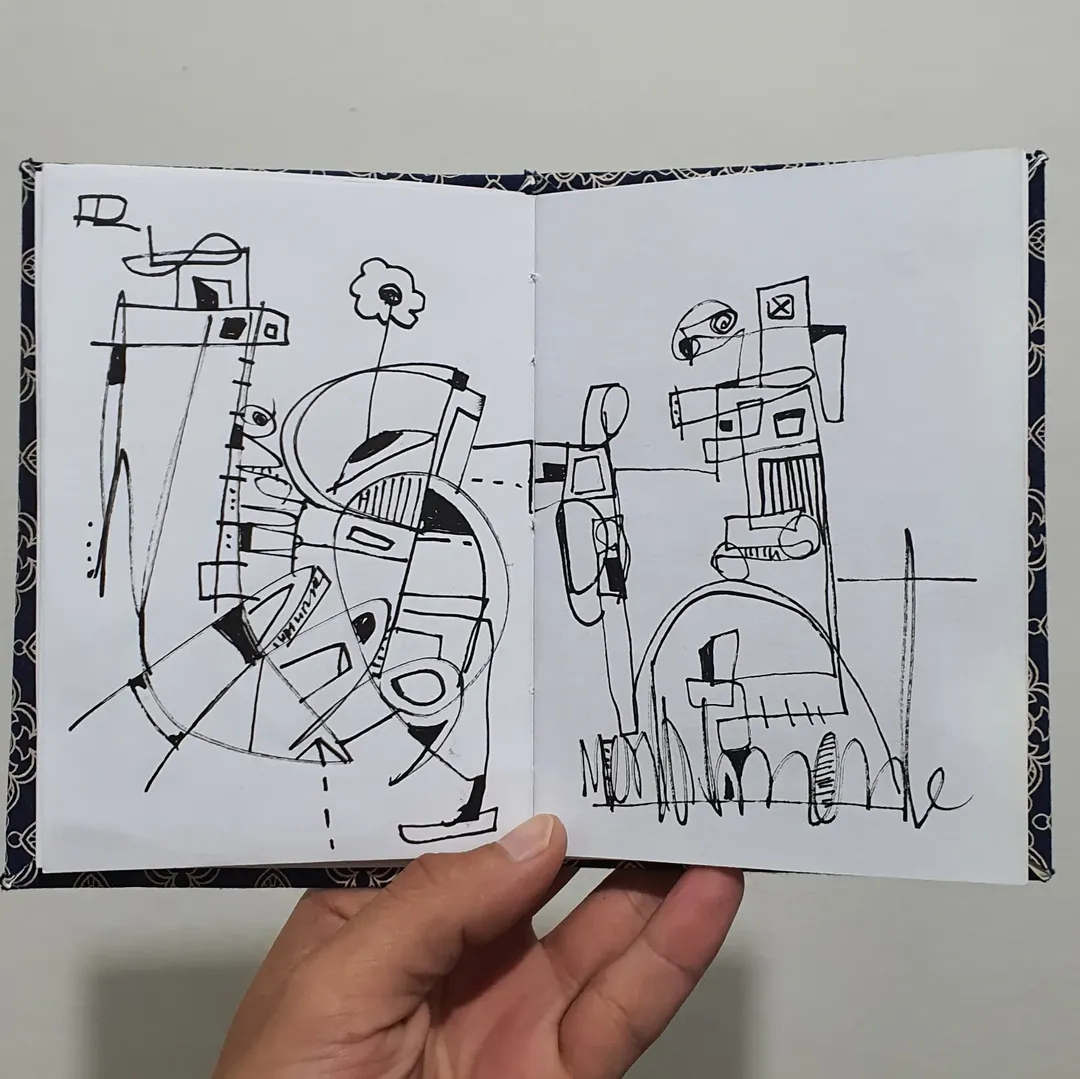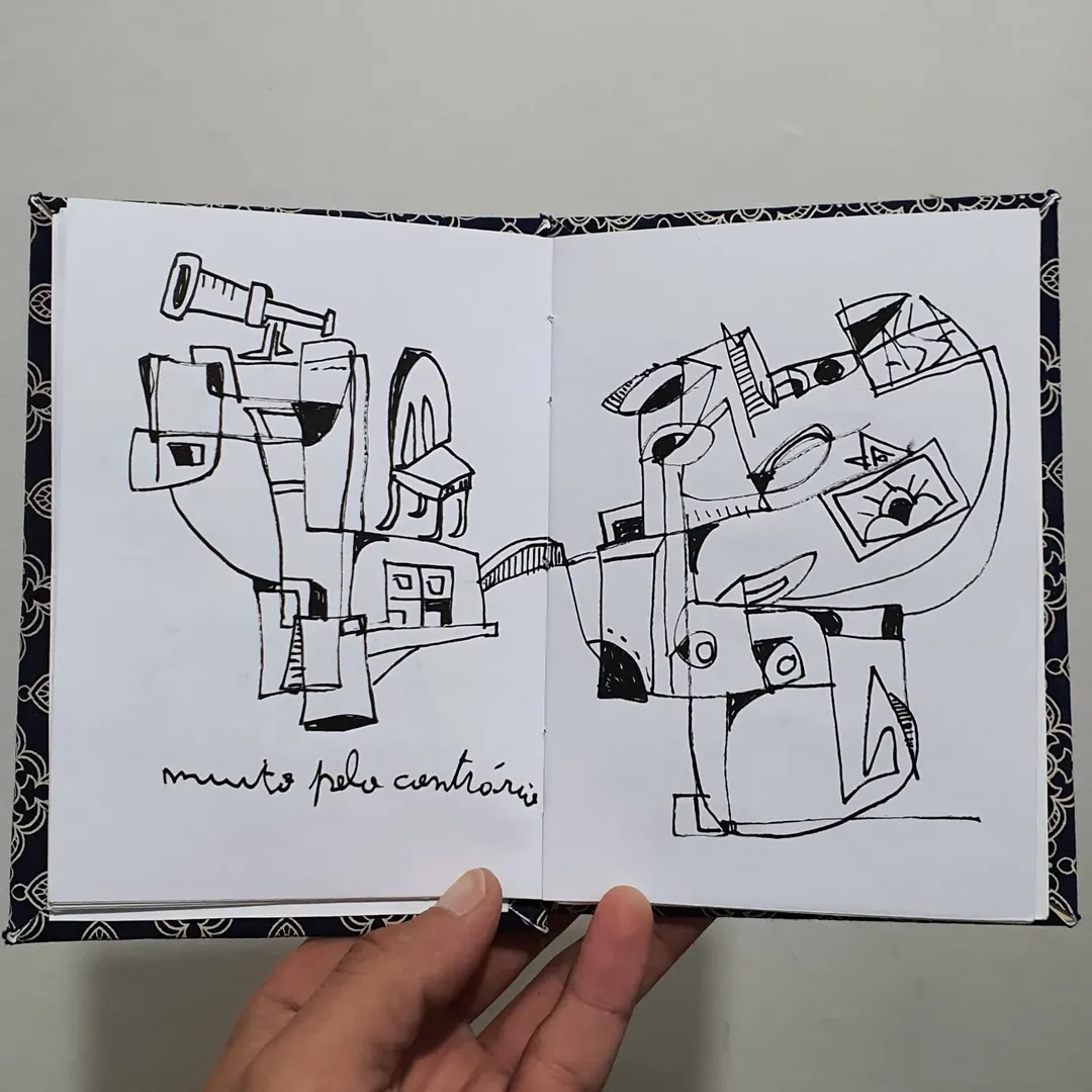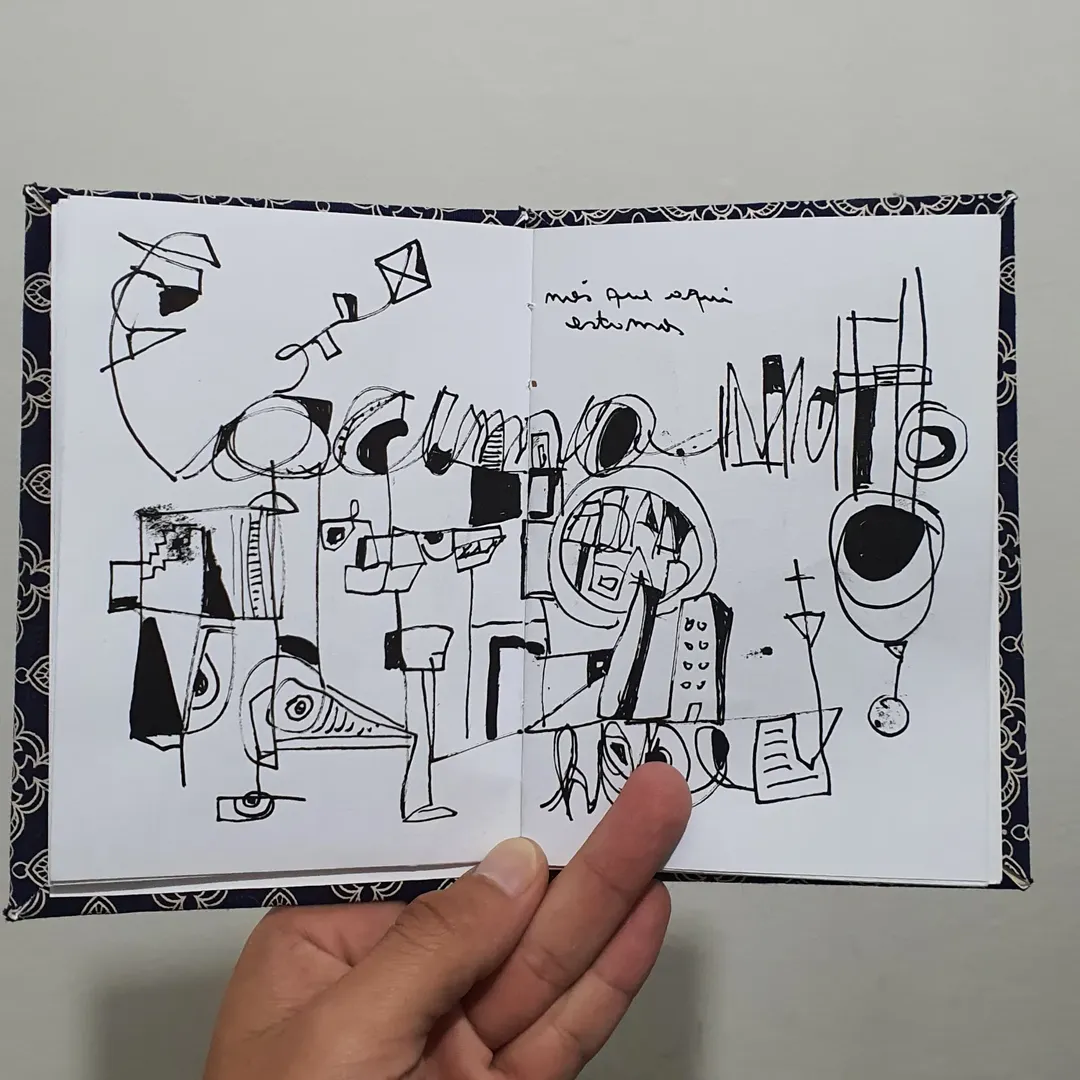 O desenho virou extensão disso: fragmentos internos que ganham forma e depois se transformam em algo maior, externo, coletivo.