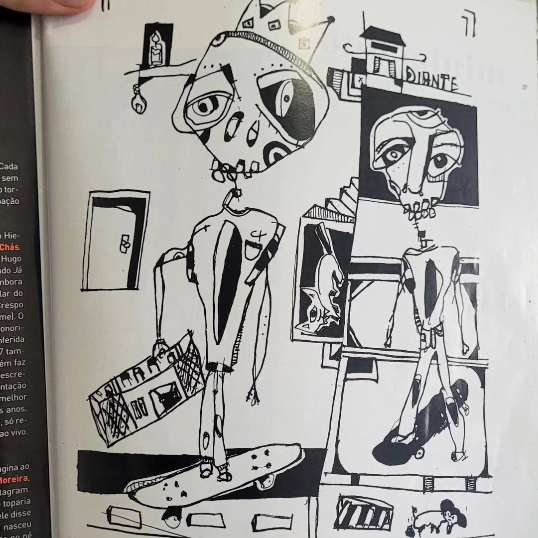 Cara, pra mim sempre foi arte, sempre foi necessidade de pobre e fetiche de rico, sabe? Eu sempre senti necessidade de me expressar de alguma maneira, de fazer algo, de ser um agente criador do meio. E tudo isso também me fez pensar que eu não conseguiria mais ficar longe, nem do skate, nem da arte. Que por sorte, conseguir viver da arte foi mais fácil do que viver do skate, então não houve um momento em que eu pensei em separar ou em largar um ou parar com o outro. Então pra mim o skate vai ser sempre essa coisa de necessidade mesmo, que já faz parte de mim, assim como a arte. Eu fico, sei lá, dias sem andar de skate, mas não fico um dia sem desenhar. Chega a ser até meio visceral a minha relação com arte. Se eu não estiver desenhando alguma coisa, tá errado.